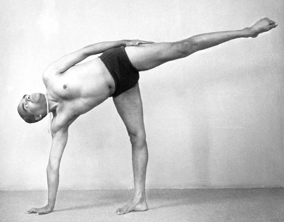 B.K.S. Iyengar in Ardha Chandrasana, Light on Yoga plate 19